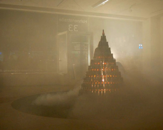 In de ingang van De Galerij staat een grote taart opgebouwd van bierflesjes. Deze worden verdeeld op de receptie als een gemeenschappelijke performenc.