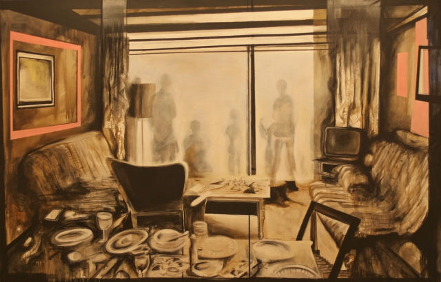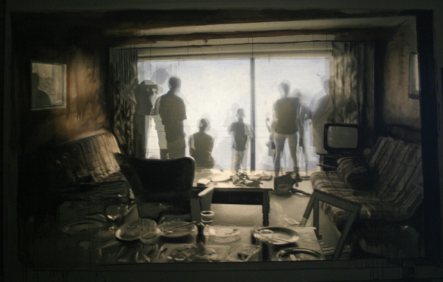 Vieuw is het uitzicht van een appartement aan de zee. Drie dia projectoren schijnen op een schilderij. Elke projector heeft een ander belichting en beeld. De projectoren gaan afzonderlijk aan en uit. Als er iemand komt voor staan gaan de projectoren aan.