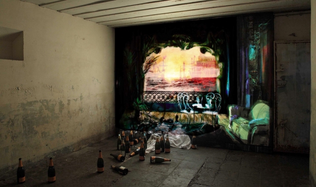 Projectors, schilderij , stoel , lege champagne flessen.