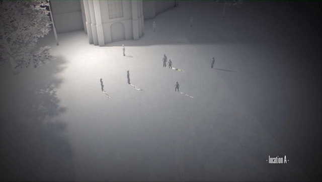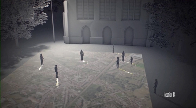 De schaduwen worden gecapteert en afgespeeld op een ander plein in de zelvde gemeente.