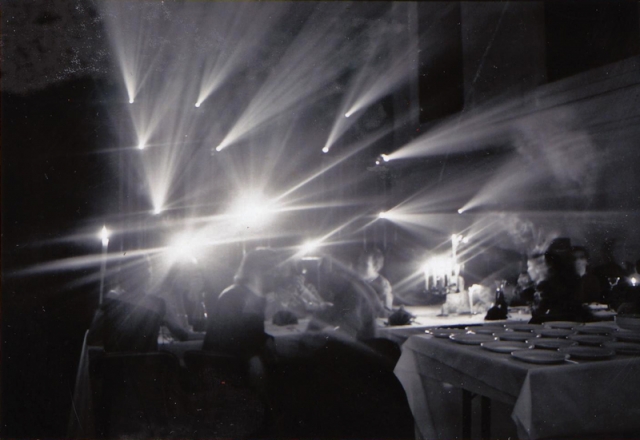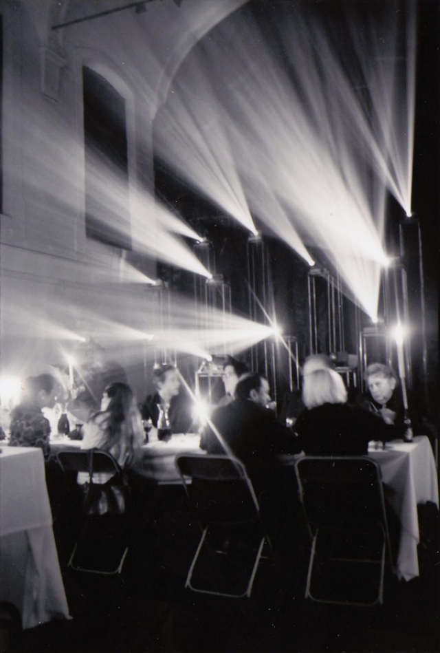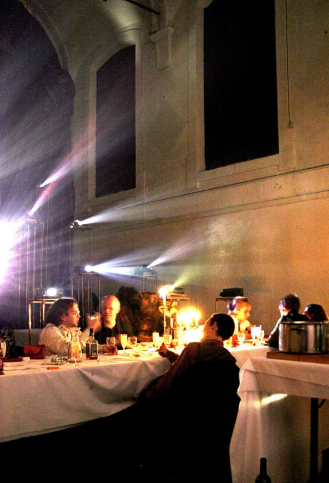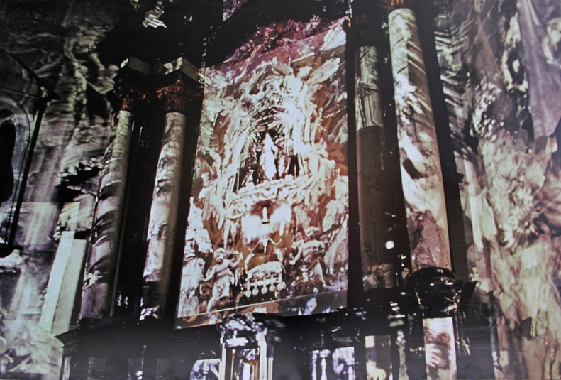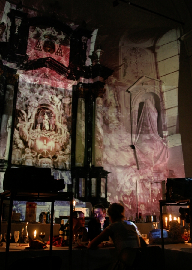 Camposanto was a light installation built in the Campo Santo chapel. It was a series of thirty six slide projections of a South German baroque altar projected on a Flemish baroque altar. Sixteen slide projectors stood among the pews of the chapel, facing the altar. The remaining projectors lit up the altar at varying angles which together formed an image. The viewer played an integral role in Camposanto. As they walked among the projections their shadows mingled with the images on the altar. To extend the role of the spectator, a few selected guests were invited to a dinner where Chef Simon Volkeart cooked before the altar. The guests dined and socialised between the projection and the projectors, making them active rather than emphatic spectators which was an important aspect of the installation. The smoke and steam from the food created 3D moving images.